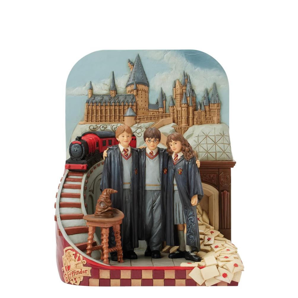 Celebrate the magic of Hogwarts with The Journey Begins – Harry Potter Trio Scene from the Jim Shore Harry Potter collection. This beautifully hand‑painted stone resin scene depicts Harry, Ron and Hermione in their Gryffindor robes outside the iconic castle, complete with details like the Hogwarts Express, flying letters and the Sorting Hat, capturing the wonder of the wizarding world in charming folk‑art style.
